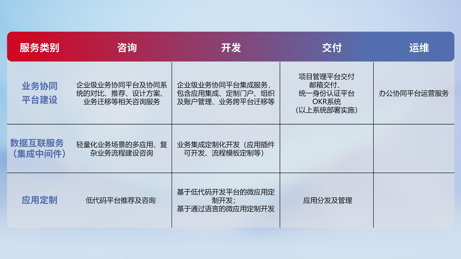 针对钉钉、、企微、、、、IDaas等平台级产品提供产品的规划、、、、方案、、交付、、、、定制化开发等服务,,,,实现如统一协同办公、、、智能客户服务、、、混合会议管理、、智能数据查询、、、等业务场景,,实现数字化转型。。