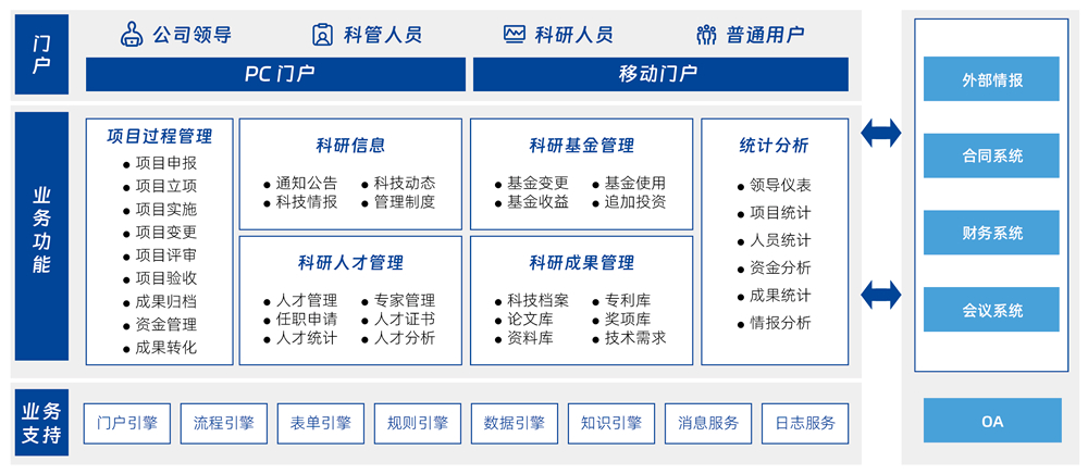 企业科研一体化管理平台,,,,涵盖科研项目全生命周期管理,,,能够对科研信息、、、、科研基金信息、、、科研人才、、、、科研成果全方位管理,,,,并实现统计分析。。。可宏观把控项目资金、、资源分配;可实时查看科研项目核心业务数据报告并进行深度分析;可实时监控各个项目动态。。