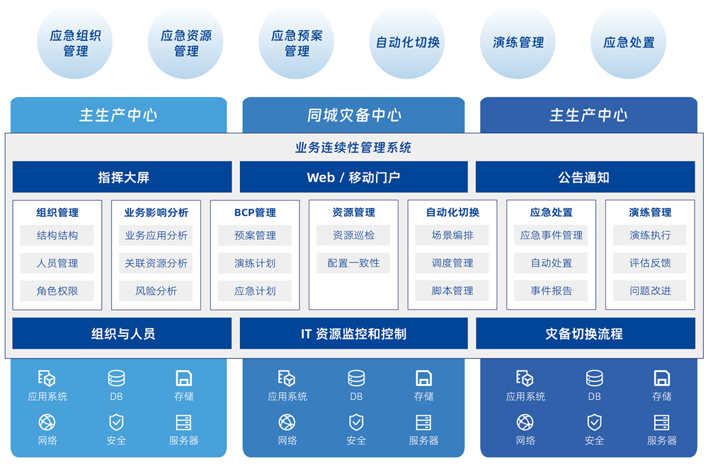 基于业务连续性全生命周期管理的设计理念,,采用一体化的技术管理平台,,,将风险分析、、业务影响度分析、、预案开发和管理、、、应急演练、、、应急响应、、应急恢复等业务连续性相关工作全面覆盖,,,,帮助企业实现数字化的预案建模、、、资源实例化、、、预案演练、、、预案自动化执行、、审计改进等各环节的闭环管理。。。。