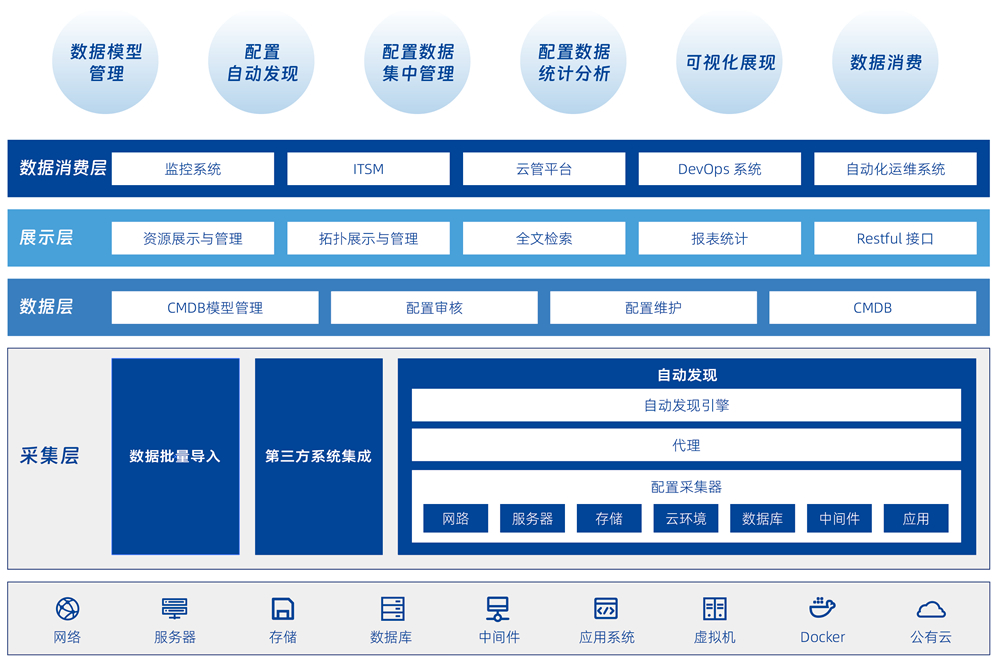 帮助用户建立统一的运维主数据,,通过各种自动化手段实现以应用为核心的全面资源管理以及运维消费场景共享。。。。系统具备灵活的 CMDB 分层建模和配置信息维护机制,,,,可以提供面向业务的 IT 架构画像,,,为各个运维工具提供集中化的资源信息管理和协同,,,为 IT 运维和 DevOps 体系下的各种运维场景提供数据消费服务。。。