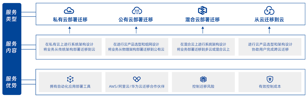 提供业务上云及云间迁移的端到端服务,,评估业务系统现状,,,,规划设计迁移架构、、、迁移技术和迁移方案,,应用及数据上云迁移实施,,,云上系统部署,,,云上数据及业务验证,,迁移后运维保障及持续优化服务。。。